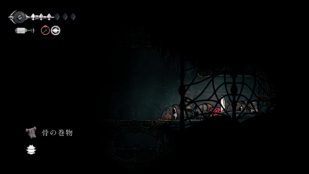 そこから上へ進み、左へ寄り道したところで骨の巻物を回収できます。右方向へ道なりに進んだ後、上へ進む際に右側にある小部屋で傷んだロザリーの紐を回収できます。ただ、その部屋は敵が2体程いて厄介なので、どうしてもロザリーが欲しい場合のみで大丈夫です。
